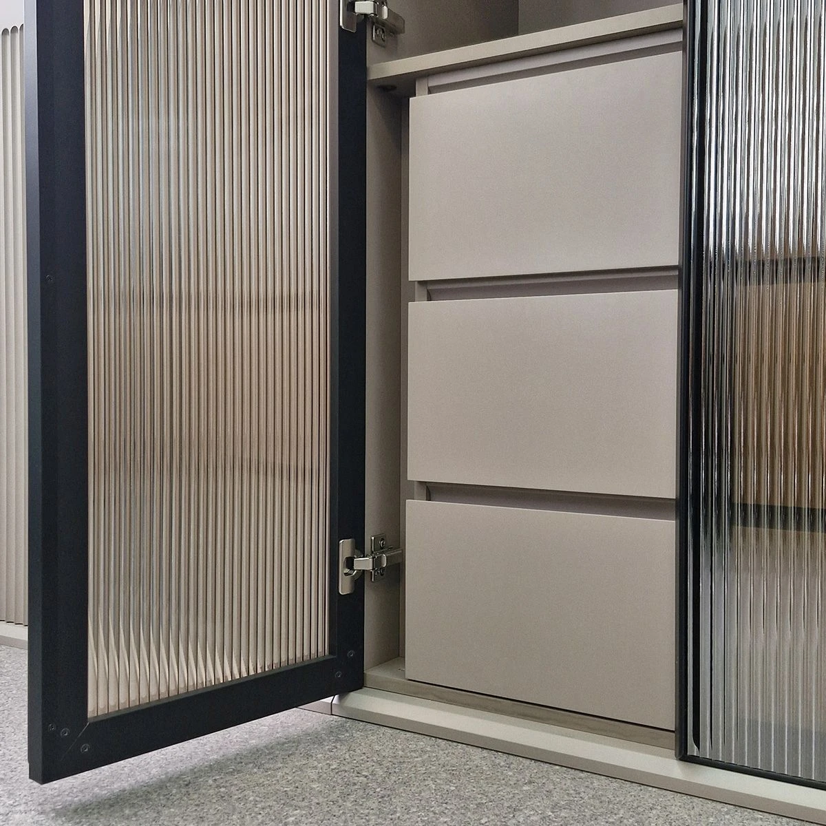 Двери: МДФ; тонированное стекло в алюминиевой рамке